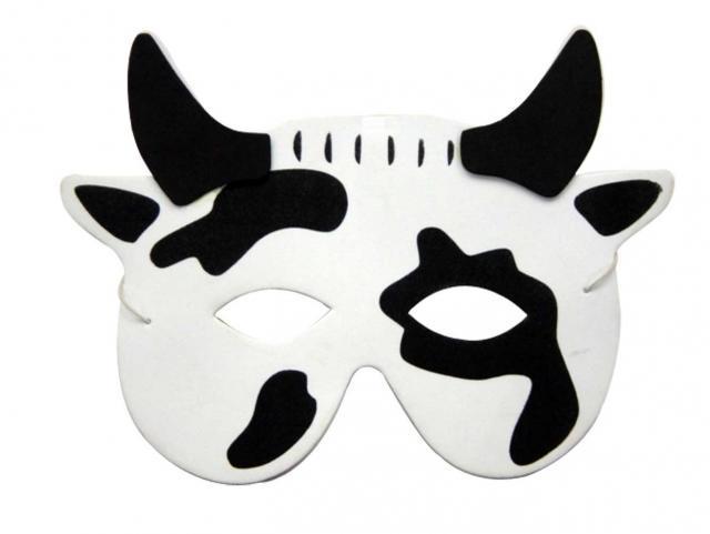 Agora com o marcador pinte manchas pretas na máscara da vaca. Cole o palito de madeira na parte inferior da máscara para que possa segurá-la até à altura do rosto.