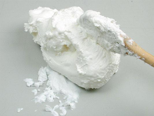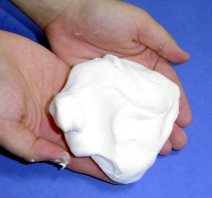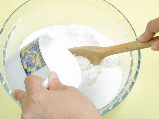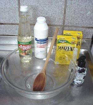 Verta 3 xícaras de chá de amido de trigo, 2 xícaras de cola, 3 colheres de sopa de vaselina e 3 colheres de sopa de suco de limão, por esta ordem, numa tigela de vidro. Mexa suavemente.
