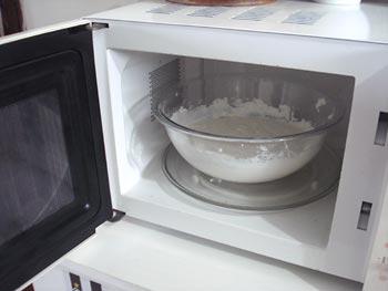 Leve a tigela ao microondas. Aqui o tempo varia consoante a temperatura de seu microondas, por isso o ideal é que aqueça um minuto, retire e mexa. Repita o processo até a massa ficar dura em cima e mole em baixo.