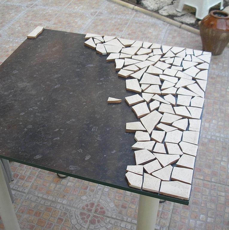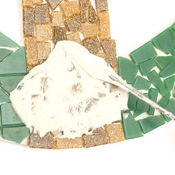 Para colar os azulejos utilize cola branca ou cola de azulejo. Algumas superfícies poderão requerer outro tipo de cola de forma a que o azulejo se fixe melhor. Cole os azulejos um a um mantendo as suas posições. Quando tiver terminado, deixe secar e, sem seguida, aplique uma camada de rejunte para preencher os espaços entre os pedaços e também para os fixar melhor no seu lugar.