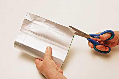 Pegue no molde da paleta já cortado e dobre as abas que têm a indicação "Dobrar". Una a face A à face B, na mesma posição, com as abas dobradas formando uma caixa, e feche o molde com fita adesiva. Idealmente a parte refletora do cartão deverá ficar voltada para dentro, e o resultado será uma espécie de paralelepípedo aberto no topo mais largo, como mostramos na imagem.