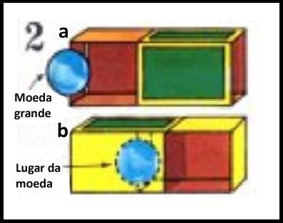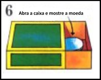 Depois mostre para alguém a caixa vazia e peça para que coloque uma moeda pequena. Esta moeda pequena deve ser vista por todos os espectadores.