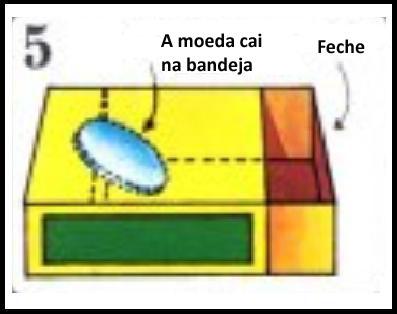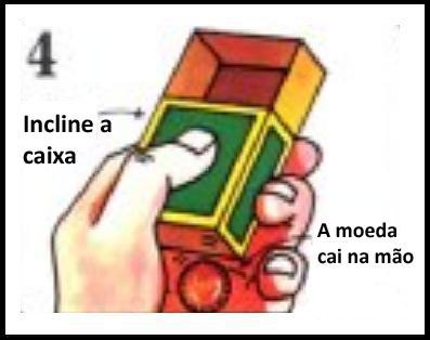 A seguir, feche a caixa. A moeda grande cai na bandeja. Esconda a moeda pequena na mão. Não deixe ninguém ver que está fazendo isso.