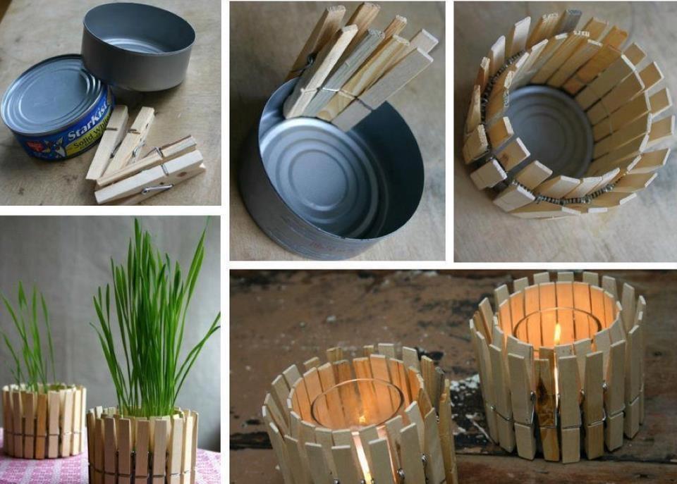 Procura uma forma de fazer porta velas com latas ainda mais simples? Então a nossa seguinte proposta de certeza que vai encantar você. Reúna tantas latas de atum quantas quiser e, uma vez que estejam perfeitamente limpas, coloque pregadores de madeira envolvendo a lata, podem ser claros como os da imagem ou mais escuros se quer um resultado um pouco mais elegante.