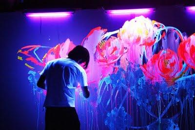 Mergulhe um pincel na tinta fluorescente e pinte uma parede ou aquilo que entender. Desligue as luzes e direcione a luz negra para a tinta. E já está, já pode admirar o excelente efeito que este tipo de tinta provoca!