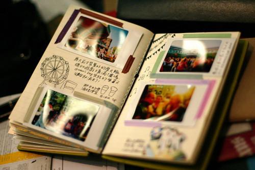 O trabalho de scrapbook pode e deve prolongar-se até ao interior do álbum, onde será mais discreto mas ao mesmo tempo evidente. Faça isso criando molduras para as fotografias, escrevendo à mão algumas citações importantes, relatando um acontecimento como em um diário, desenhando, carimbando imagens, colando documentos de memórias, colando imagens alusivas ao tema, e muito mais. Inspire-se no exemplo ao lado, de um álbum scrapbook de viagens!