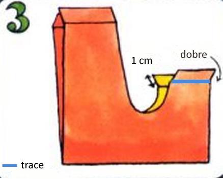 Depois dobre o avião ao contrário. Trace uma linha de 1 cm desde o extremo da fila como no desenho. Dobre os extremos da fila sobre a linha traçada em direção oposta uma a outra.