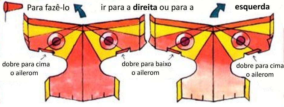 Como fazê-lo girar: se quiser, pode fazer com que o planador voe em diferentes direções. Faça dois pequenos cortes na parte posterior das asas para fazer ailerons, como no desenho. Para fazê-lo ir para a esquerda, dobre o ailerom esquerdo para cima e o direito para baixo. Para fazê-lo ir para a direita, dobre o ailerom direito para cima e o esquerdo para abaixo.