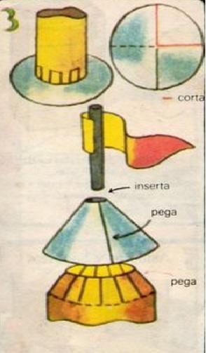 Para terminar corte um círculo com duas vezes o tamanho da torre, corte um quarto do círculo e faça um cone. Cole uma bandeira de papel a uma vara, recorte a ponta do cone e insira a vara dentro do cone. Dobre para dentro os cortes da parte superior da torre, ponha cola e coloque o cone em cima.