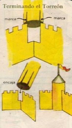 Depois dobre o papel como no desenho. Cole os guias ao torreão por baixo da muralha (ameias). Este é o caminho das rondas.