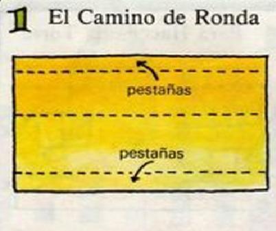 Para fazer o caminho, corte um papel forte com o mesmo comprimento que as paredes do torreão. Faça os sinais, como vê na imagem. As dobras exteriores são os guias.