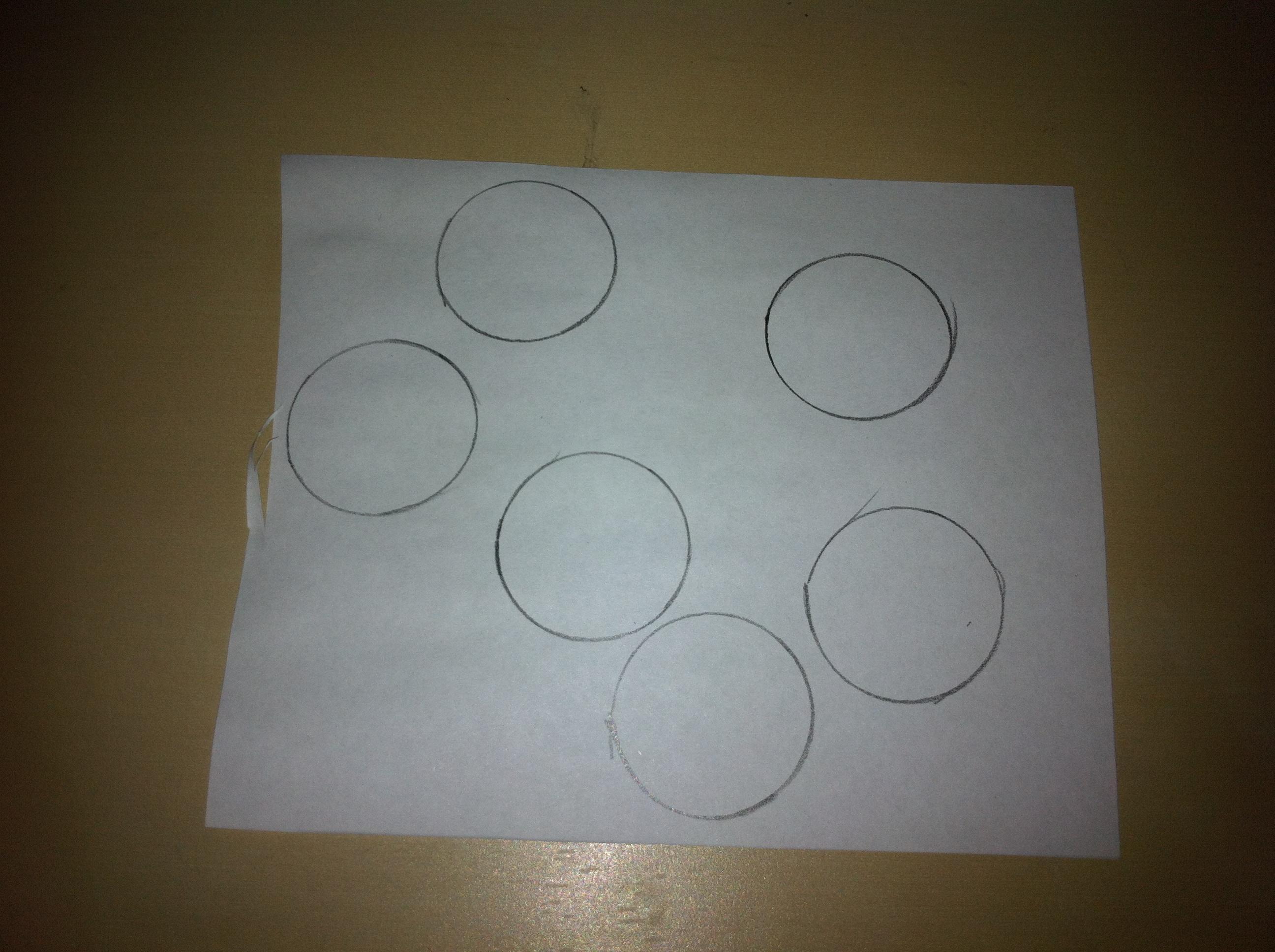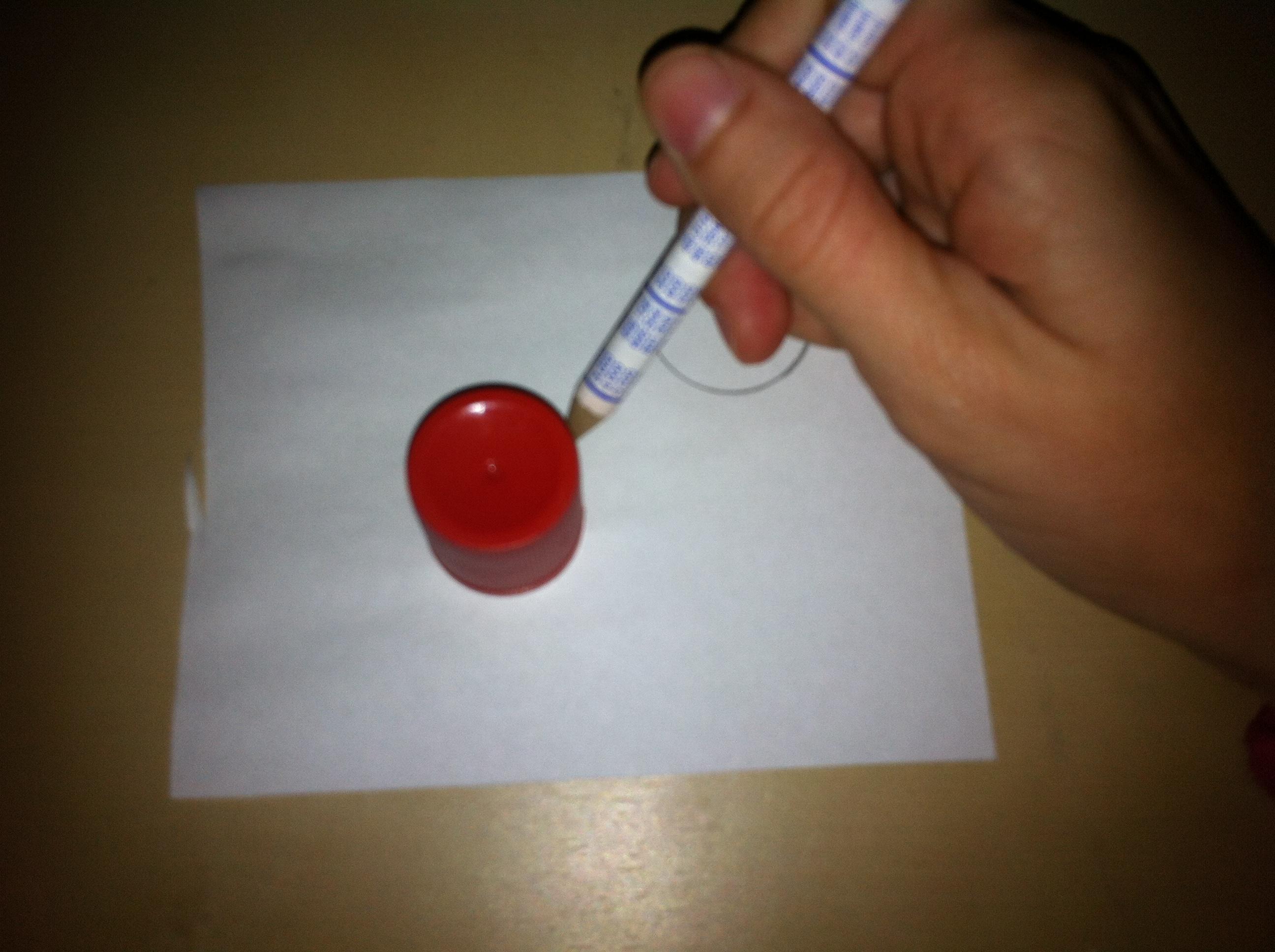 Em um pedaço de papel branco faça círculos menores (nós utilizamos a tampa da cola para fazê-los).