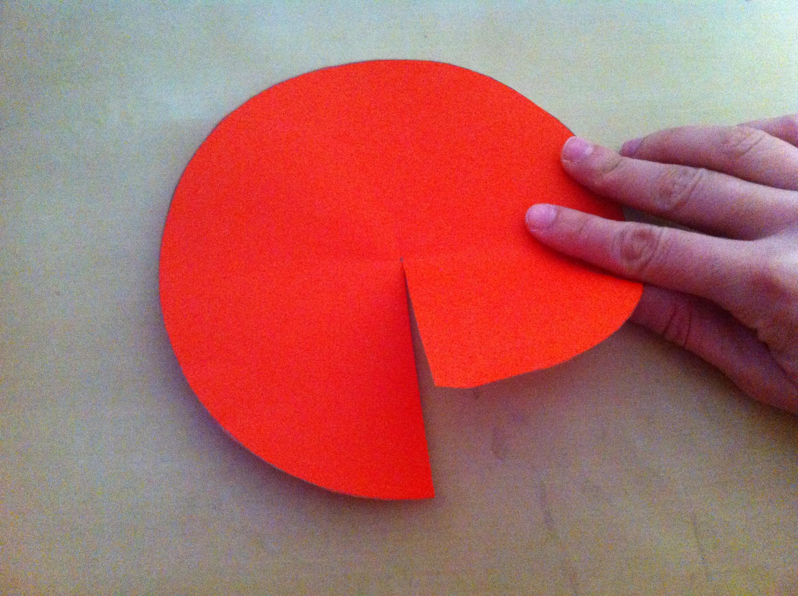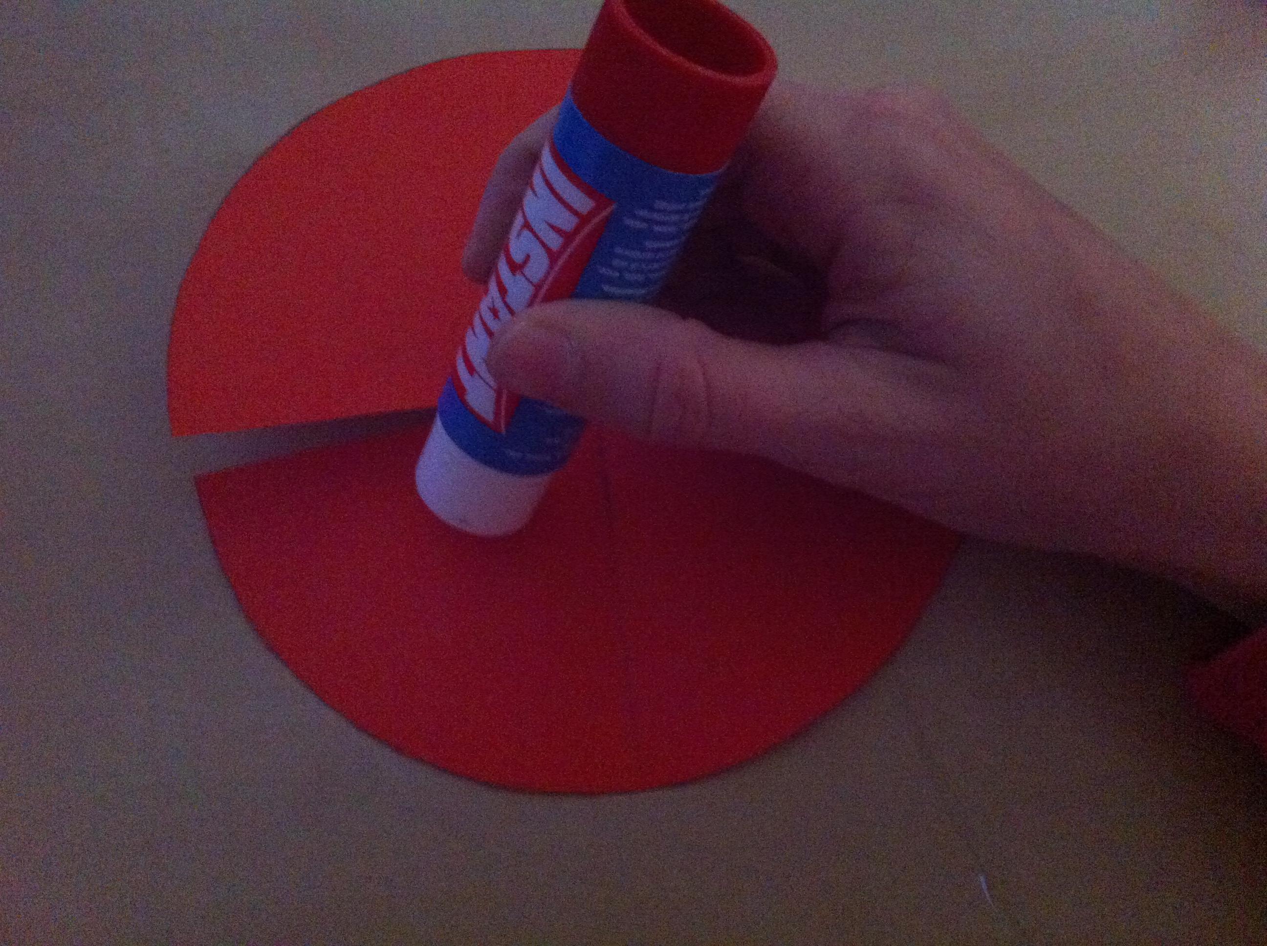 Ponha um pouco de cola em uma quarta parte do círculo começando por onde fez o corte (observe a linha marcada com lápis na foto para saber até onde tem que colocar cola).