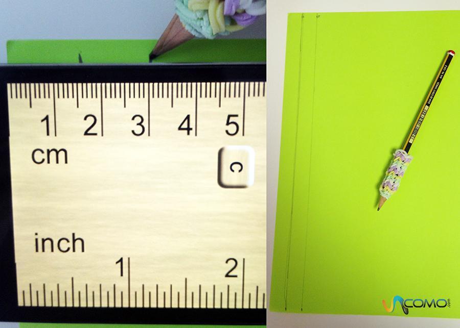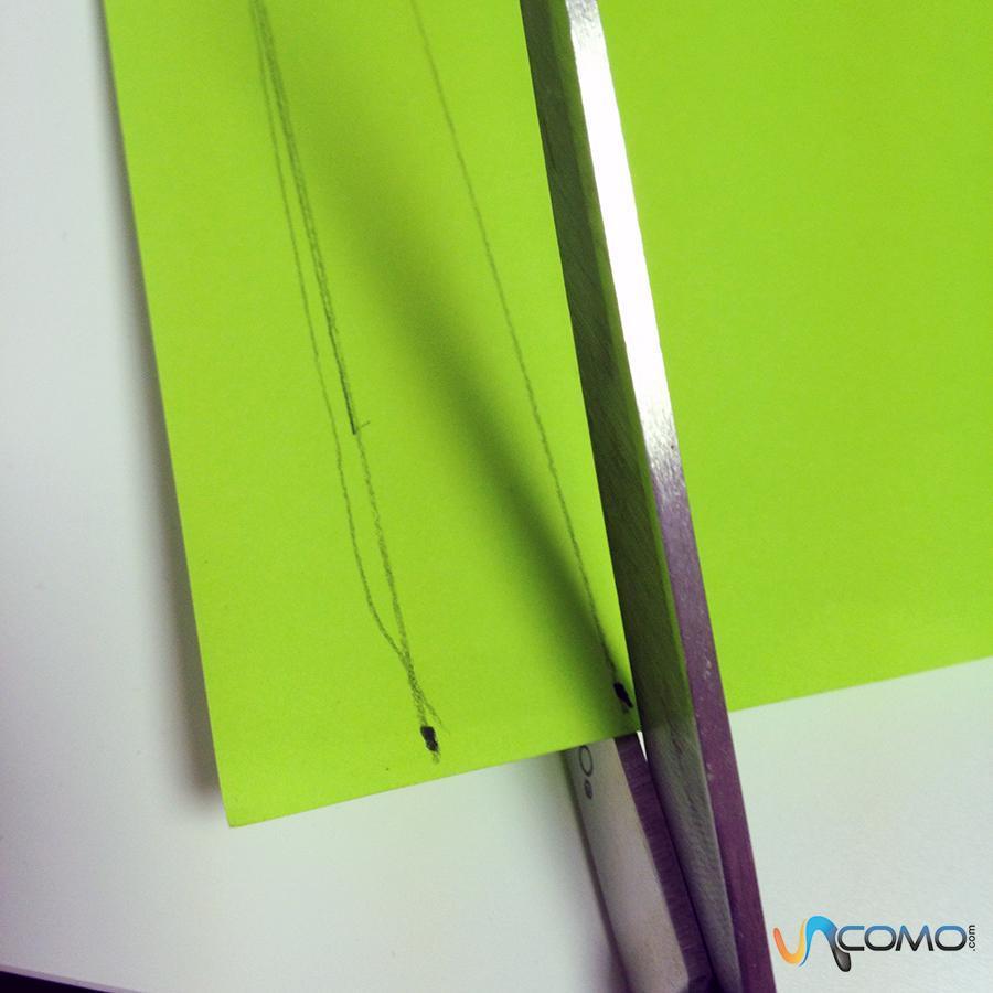 Para assegurar que as marcas coincidam, pegue a régua e coloque na marca superior para comprovar se encaixa com a inferior. Desenhe a linha com o lápis de forma suave. Quando tiver as duas linhas, pegue a tesoura e corte a folha seguindo a segunda linha.