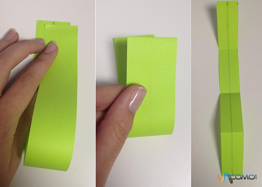 Após cortar a tira, pegue a extremidade inferior e a leve até a superior para dobrá-la ao meio, repare na fotografia. Após dobrá-la, volte a fazer o mesmo para dobrar a tira de novo pelo centro. É importante que marque bem com os dedos as dobras porque depois de dobradas pela segunda vez, você deve desdobrá-las.