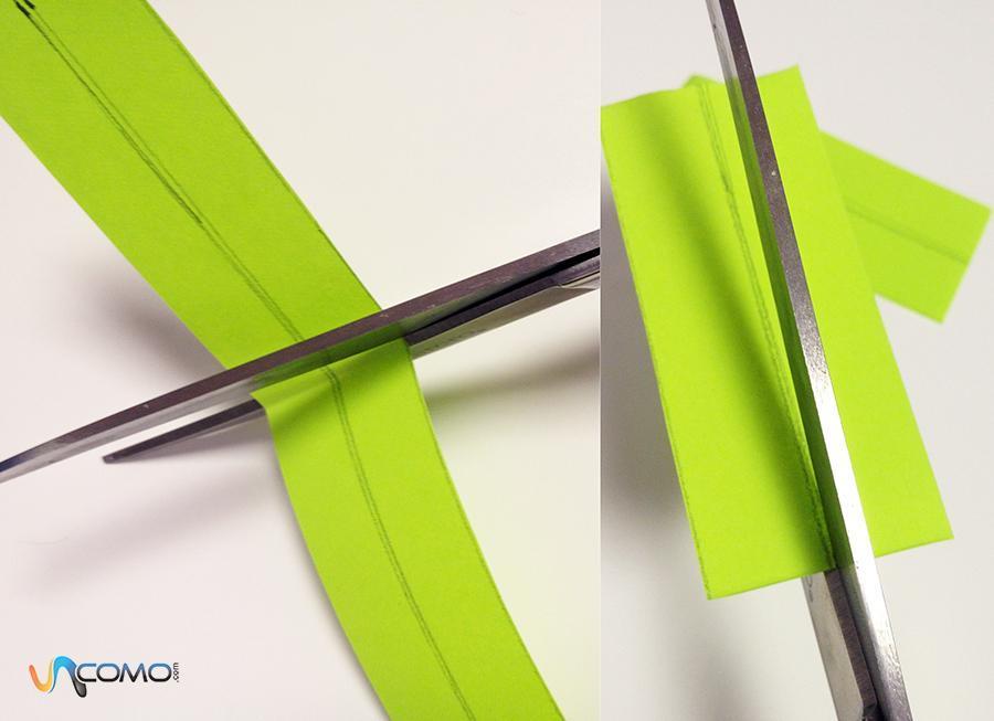 Agora, para continuar com a elaboração do coração em 3D, volte a pegar a tesoura e corte seguindo as linhas que marcou ao dobrar a tira de papel. Você deve ter quatro pedaços de papel, cada um com uma linha a lápis no meio. É o momento de cortar cada pedaço pela linha desenhada, de maneira que obtenha oito tiras.