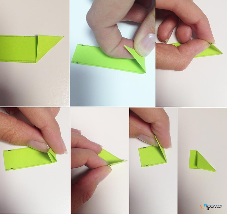 Pegue uma das tiras, segure o canto direito inferior e leve para a borda superior para criar um triângulo. Agora, pegue a ponta desse triângulo e a leve para a esquerda, repare na fotografia. Pegue a ponta superior e volte a dobrar o triângulo, agora para baixo. Deverá dobrar o triângulo mais quatro vezes, até que fique um retângulo pequeno.