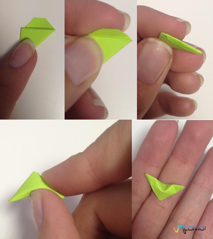 Agora corte os cantos do pequeno retângulo em diagonal de maneira que forme um trapézio. Pegue a tira e dobre-a para dentro. Após dobrá-la, introduza a tira na primeira abertura e marque-a bem. Verá que o resultado é um triângulo. Pegue a ponta até a parte superior e pressione com o dedo polegar a zona central inferior. Pressione também as pontas do coração de papel.