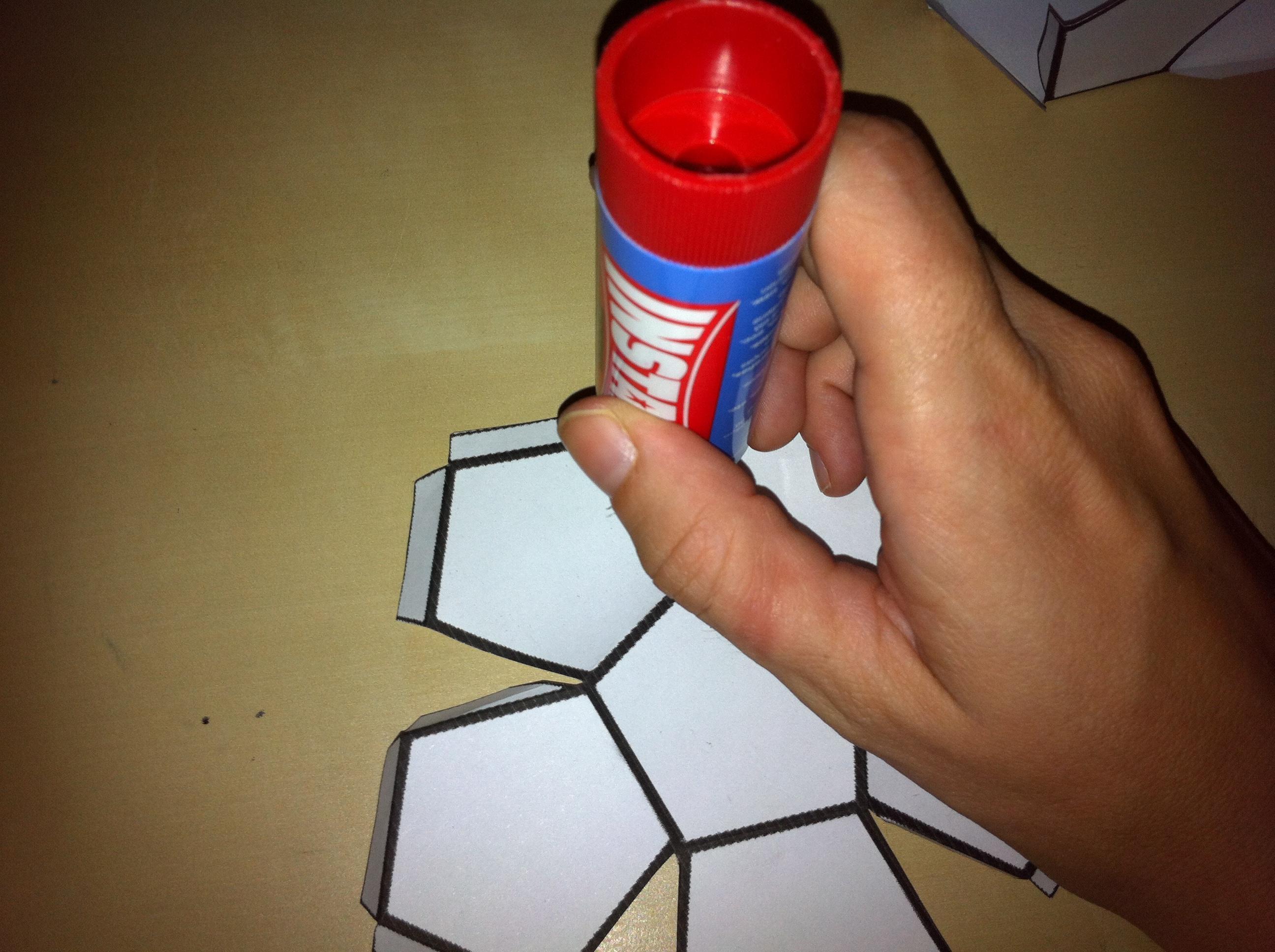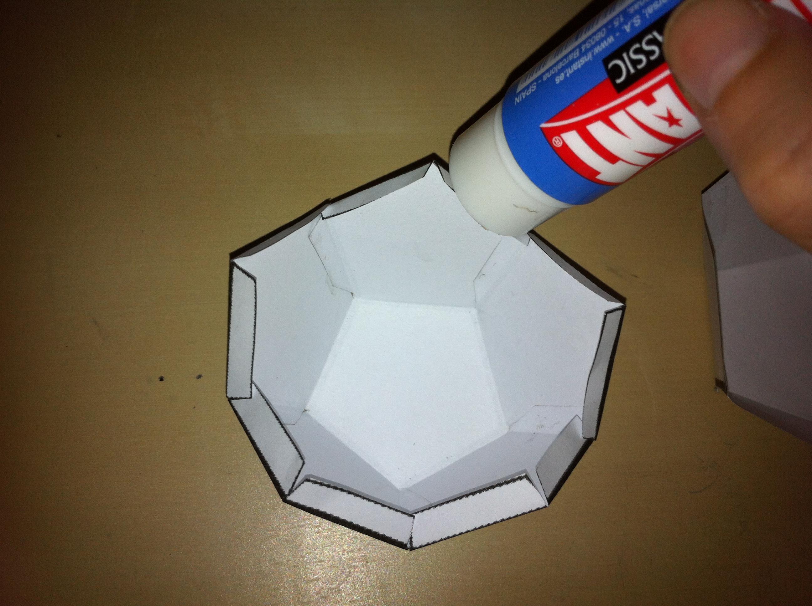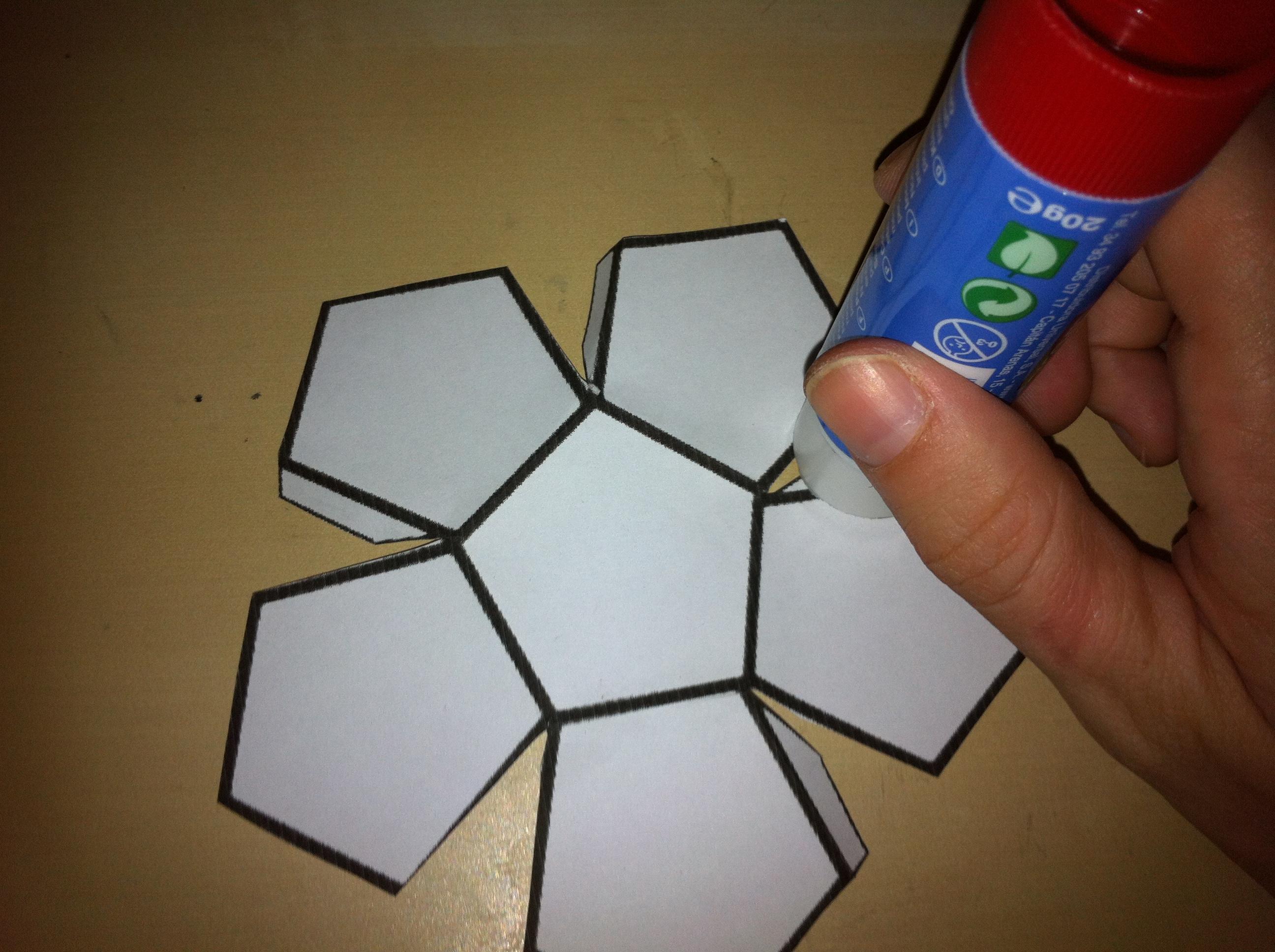 Agora ponha cola nas abas que sobram e una com a outra metade do dodecaedro. Se for difícil colar, ponha cola na outra parte do dodecaedro para que se torne mais simples.