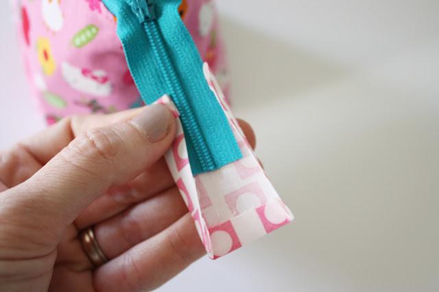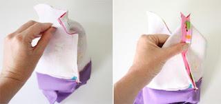 Corte um pedacinho de tecido, em forma retangular, dobrando as extremidades para dentro, para prendê-lo no zíper: coloque as dobras por baixo do mesmo e costure-o.