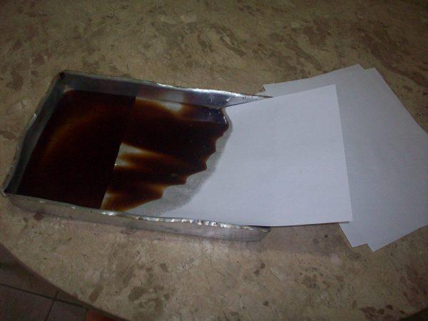Quando o papel estiver coberto de café, deixe passar cinco minutos para que pegue bem o líquido. Depois, retire o papel da bandeja e seque com um secador de cabelo. Mantenha o secador a uma distância prudente para não queimar o papel e lembre-se de aplicar o calor em ambos os lados.