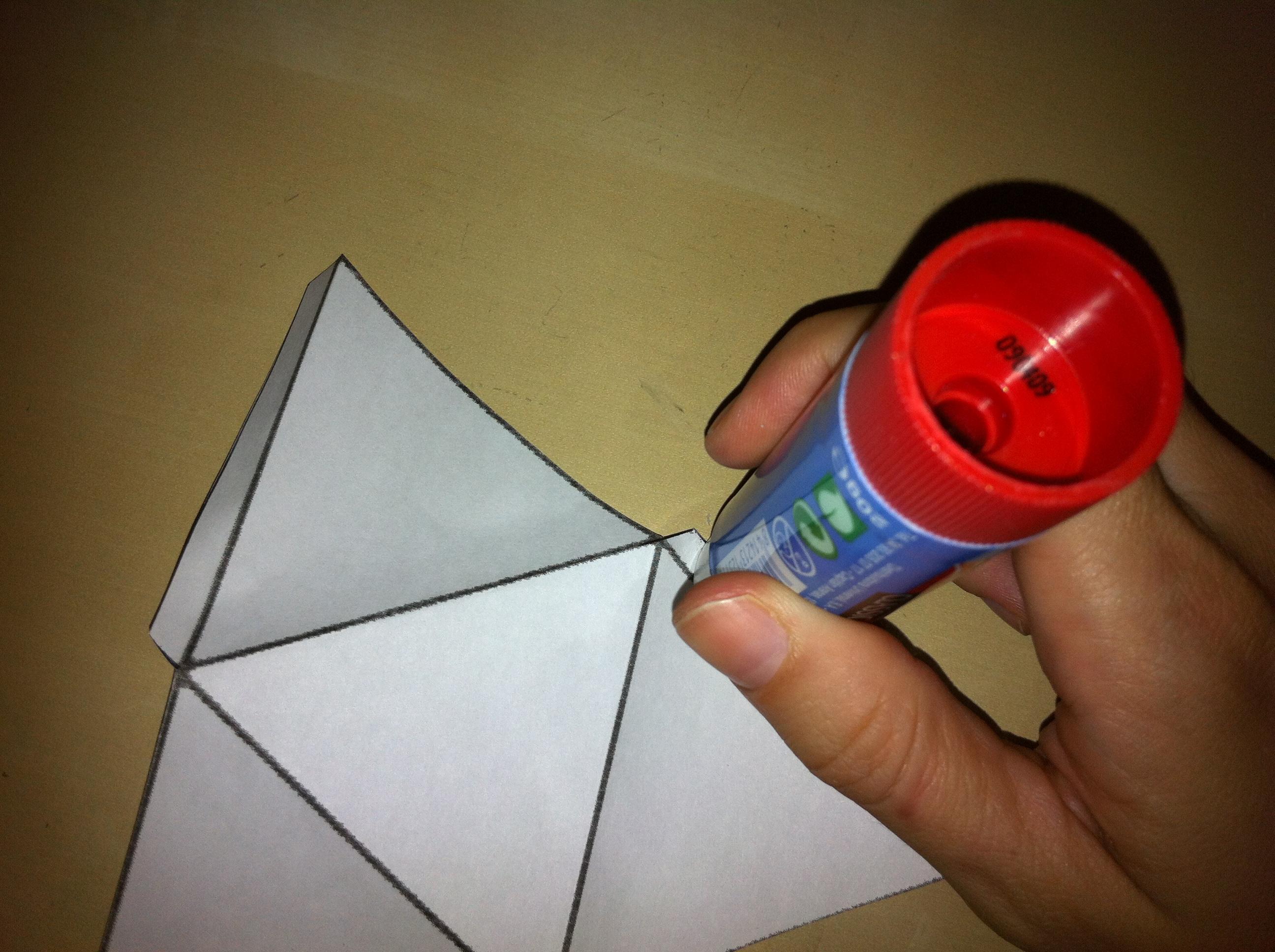 - Recomendamos que antes de começar a por a cola tente montar o tetraedro sem ela para entender onde tudo se encaixa. Se já entendeu onde tudo se encaixa, comece por colocar cola numa das abas e cole-a. Faça isto sucessivamente com o resto das abas.