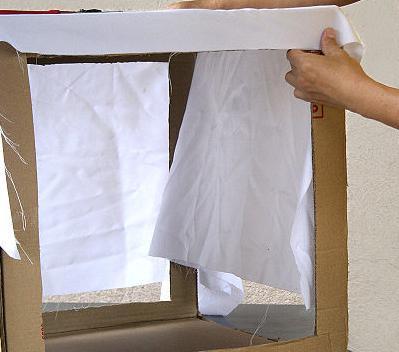 Após fazer os buracos na caixa de papelão devemos colocar um pedaço de tecido. Este pedaço de tecido pode ser de lençóis. O tecido de algodão é muito bom para fazer a caixa de luz já que é um tecido resistente, mas que deixa passar a luz e, além do mais, dá um tom muito branco e nítido à luz. Corte um pouco de cartolina preta opaca para cobrir as zonas escuras da caixa para que a luz não "escape" da caixa de luz na hora de tirar fotografias.