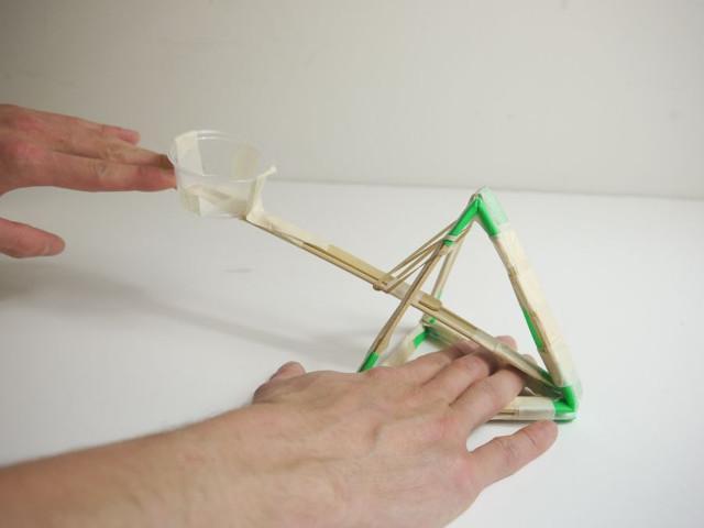 Coloque uma mão no interior da moldura da pirâmide e pressione firmemente aí. Use a gema dos dedos na outra mão para pressionar para baixo na extremidade do braço da catapulta. Puxe o braço para trás e depois solte permitindo que seus dedos deslizem fora dos espetos. E já tem a sua catapulta feita! Confira também estes outros artigos com várias ideias para fazer com a criançada lá de casa: