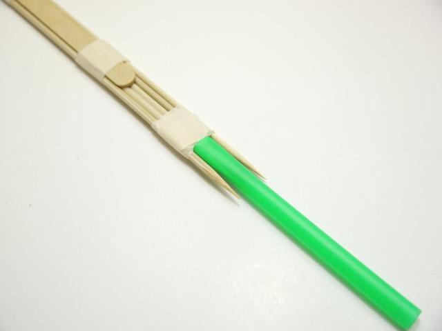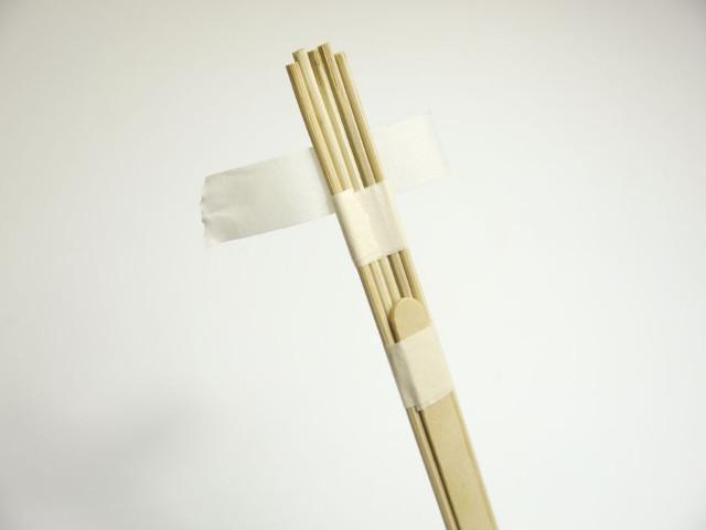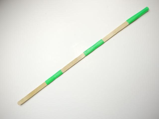 Para fazer o braço da catapulta, coloque 5 espetos de forma plana e perfeitamente alinhados. Envolva com fita adesiva ao redor dos espetos em, pelo menos, dois lugares.