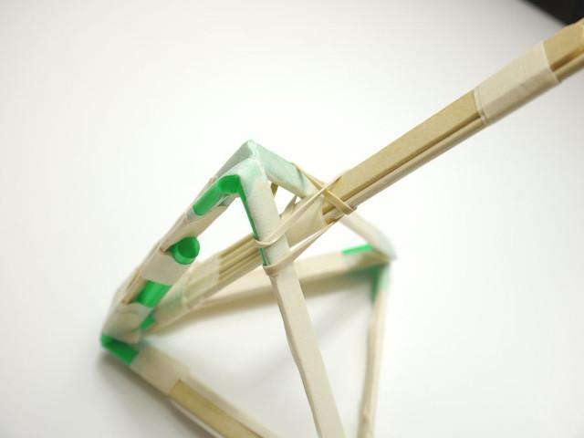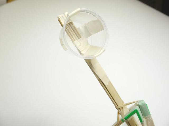 Coloque um pedaço de fita em um ângulo perpendicular à extremidade superior do braço da catapulta.