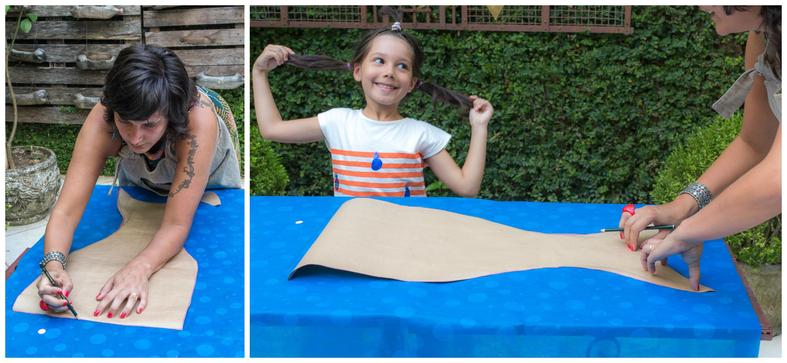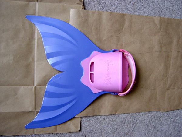 Apoie o monofin sobre a ponta da cauda e contorne-o sobre o lugar que estariam os pés. Feito isso, recorte o desenho da cauda e tente deixar um sobra de um dedo no contorno.