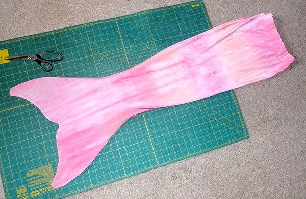 Dobre o tecido da cauda de sereia em duas partes do mesmo tamanho, coloque o molde sobre ele e recorte essas duas partes ao mesmo tempo. Deixe uma sobre de 1 a 2 dedos nas extremidades.