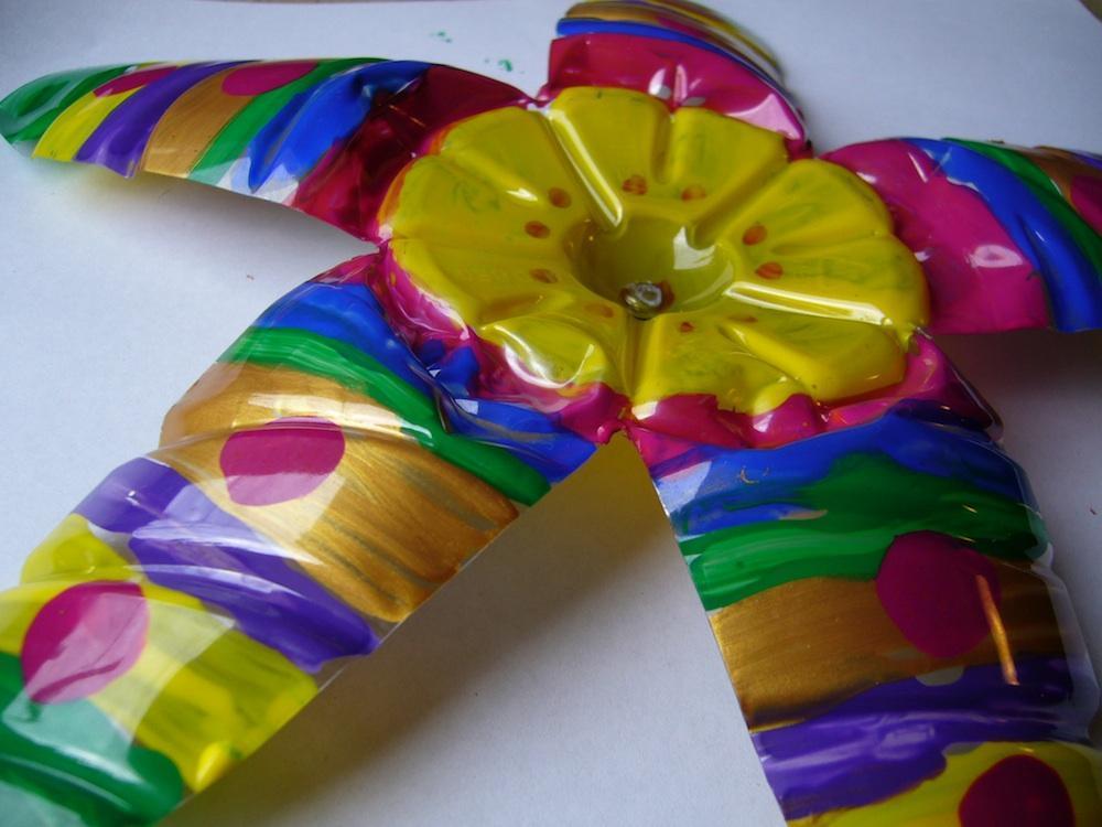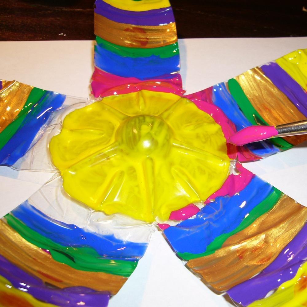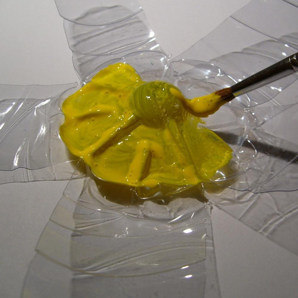 Já pode começar a pintar a flor. Na imagem começamos por pintar o centro. Pode utilizar a cor que quiser mas recomendamos-lhe que utilize cores vivas e alegres para dar mais alegria à flor de plástico feita com uma garrafa.