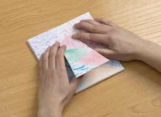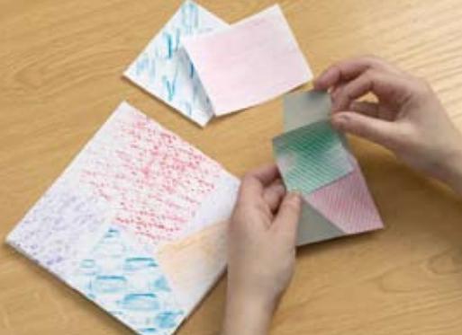 A seguir, recorte outro pedaço de papelão em forma de trapézio e forre com os mesmos papéis pintados com a técnica do frottage.