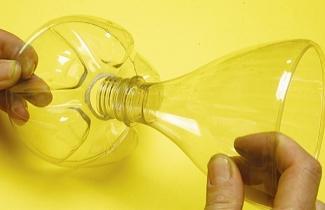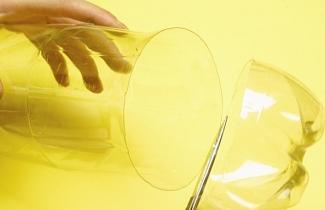 Primeiro que tudo você deve cortar as duas garrafas pela parte superior da boca da garrafa, de 5 a 10 cm. Em uma delas você deve cortar a boca da garrafa com uma faca de serra ou tesoura.