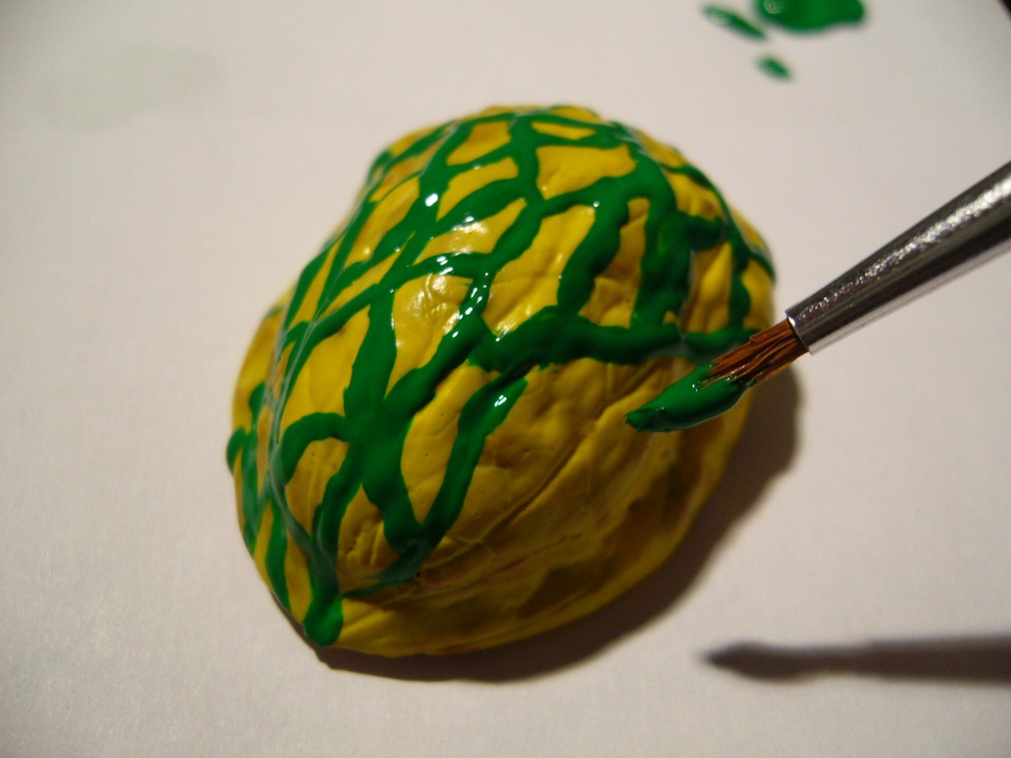 Pinte os detalhes da casca com tinta verde. Veja a imagem.