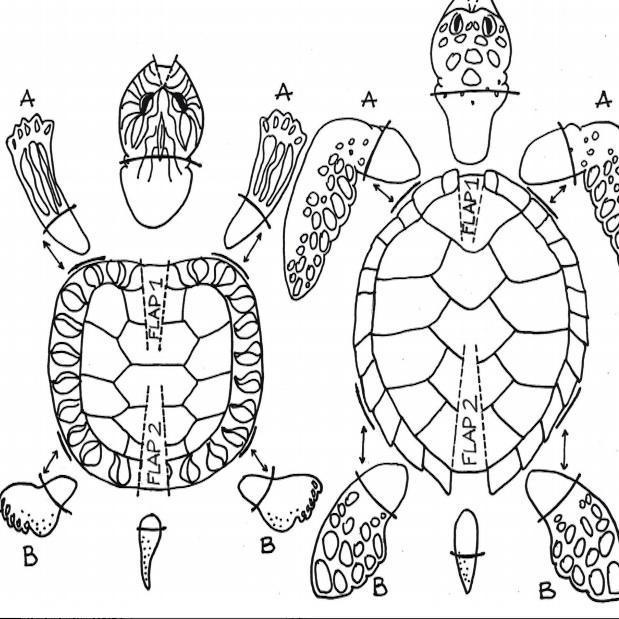 Carapaça da tartaruga: Corte as guias seguindo as linhas de traços, nº 1 e nº 2 ("Flaps" 1 & 2). Cuidando para não cortar totalmente. Para dar forma à carapaça junte o rabo com as duas partes da carapaça por cima da lingueta (Flap 1). Faça o mesmo com a lingueta 2 (Flap 2).