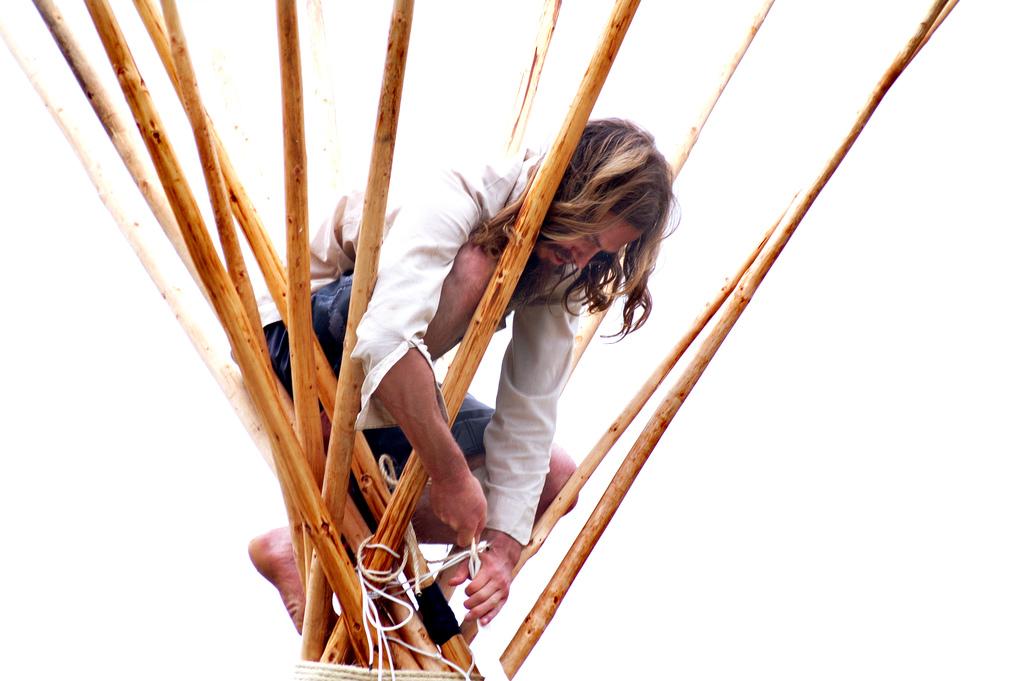 Tal como acontecia com os palitos, se unir as extremidades inferiores dos sarrafos, elas vão formar uma espécie de círculo. A diferença é que desta vez você vai mesmo unir as partes inferiores da sua estrutura. Use o barbante e prenda bem os pés da sua tipi.