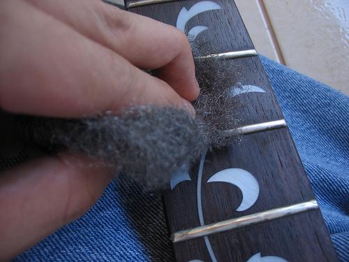 Para facilitar esta tarefa e caso não esteja a conseguir remover a sujeira, pode utilizar um solvente que não seja muito agressivo. Mas atenção, não deve utilizar diluente, pois pode danificar o verniz da sua guitarra. No final, pode esfregar a escala com um pedaço de palha-de-alço, seguinte sempre o veio da madeira, mas sempre suavemente e com cuidado.