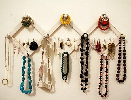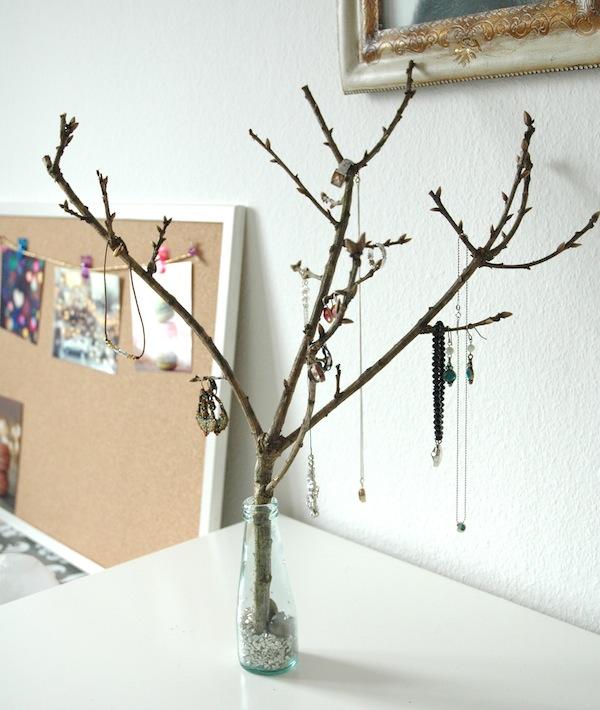 Em árvores. Não, não estamos querendo dizer que deva organizar suas bijuterias no jardim, penduradas em árvores, mas sim que traga as árvores para dentro de casa! Você poderá, de uma forma muito originar, pendurar suas bijuterias em um ramo de árvore pintado ou não e fixo a uma base, como na imagem ao lado. O resultado é surpreendente e permite bastante organização!