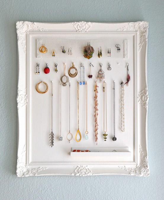 Em um quadro. Já imaginou suas bijuterias virarem quadro decorativo? Isso é possível, e de forma muito simples! Para fazer um quadro de bijuteria você apenas irá necessitar de uma moldura e uma tela de rede fina (como as telas mosquiteiras) ou cartolina. Fixe uma à outra, com cola quente, como se estive emoldurando um quadro, e depois é só pendurar seus brincos, pulseiras e colares nos orifícios da tela ou perfurações criadas na cartolina!
