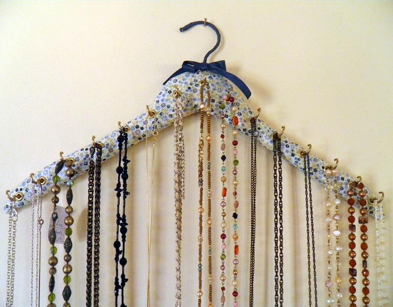 Em cabides. Cabides também se revelam uma excelente opção para organizar suas bijuterias e você não terá de gastar dinheiro pois é um objeto que todas temos em nossos roupeiros! Para isso pegue em um cabide de madeira que não esteja utilizando e decore-o ao seu gosto envolvendo-o em tecido ou pintando-o; em seguida fixe ganhos de metal nele e pendure-o na parede, para conseguir um organizador de bijuteria decorativo, ou dentro do roupeiro.
