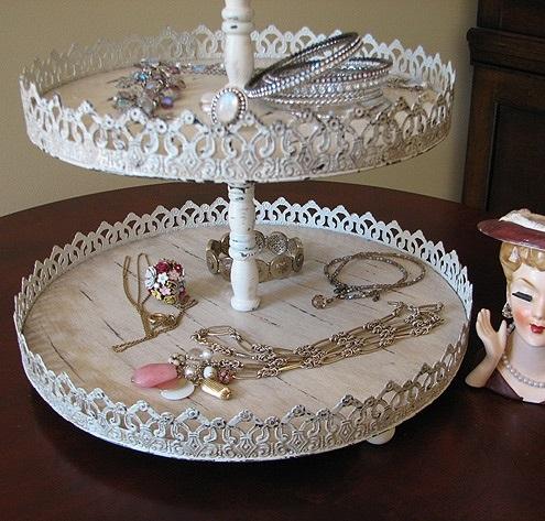 Em bandejas. Se você tiver uma bandeja bem bonitinha que queira usar como elemento decorativo no seu guardo, pode colocar suas bijuterias nela como se de um expositor se tratasse! Blogueiras de moda por todo o mundo usam essas bandejas para colocar seus frascos de perfume, mas para você, que procura como organizar a bijuteria, ela se revelam uma opção a ter em conta, tal como mostramos na imagem ao lado!