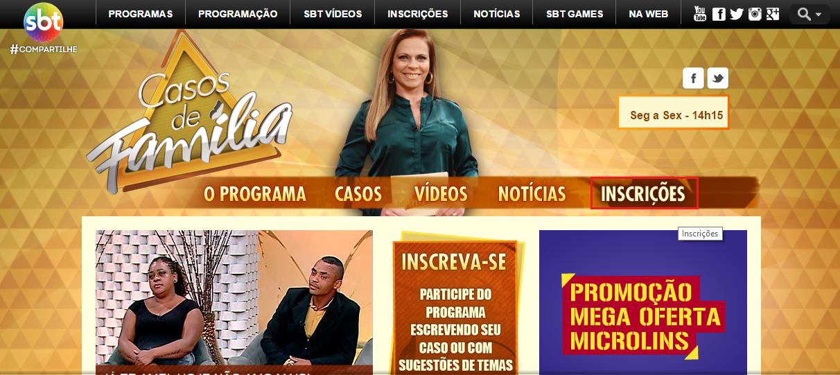 Para se inscrever em Casos de Família, você deve acessar o site do programa e clicar na aba "Inscrições".