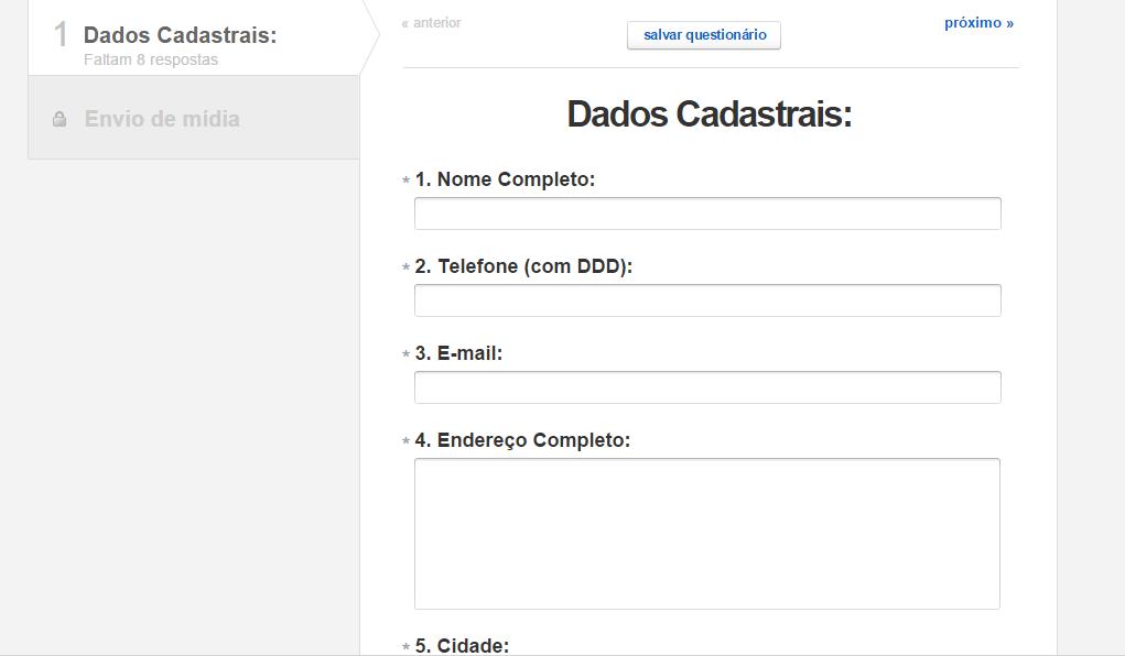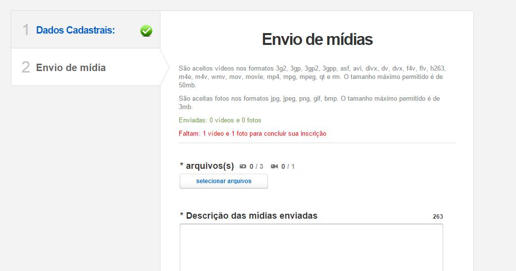 Confirme os dados e clique em "Próximo". Para completar a sua inscrição no quadro Dando um Retoque da Ana Maria Braga, você precisa de gravar um vídeo do cômodo e tirar umas fotos. O vídeo e as fotos servirão para a produção do programa ter uma noção de como é o ambiente da casa que você pretende reformar. Você deverá enviar um vídeo e no máximo 3 fotos. Depois de anexar o vídeo e as fotos, em baixo tem um campo onde deverá fazer uma breve descrição das mídias enviadas.