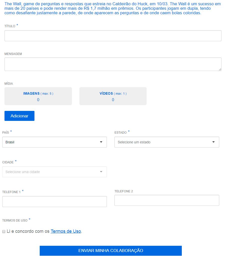- Preencha todas as informações corretamente e não despreze o campo de mensagem. É nessa parte que você tem a oportunidade de contar à produção do Caldeirão do Huck porque você é um bom candidato. Escreva a sua história de vida, o porquê o prêmio te ajudaria e o que você faria com o dinheiro e fale sobre os seus conhecimentos, se você estudou, gosta de ler, sabe muito. Uma dica é pensar: se você estivesse selecionando candidatos para o programa, que tipo de história seria interessante para levar ao auditório? Na hora de fazer o rascunho, tenha em mente que a mensagem pode ter até 2048 caracteres;