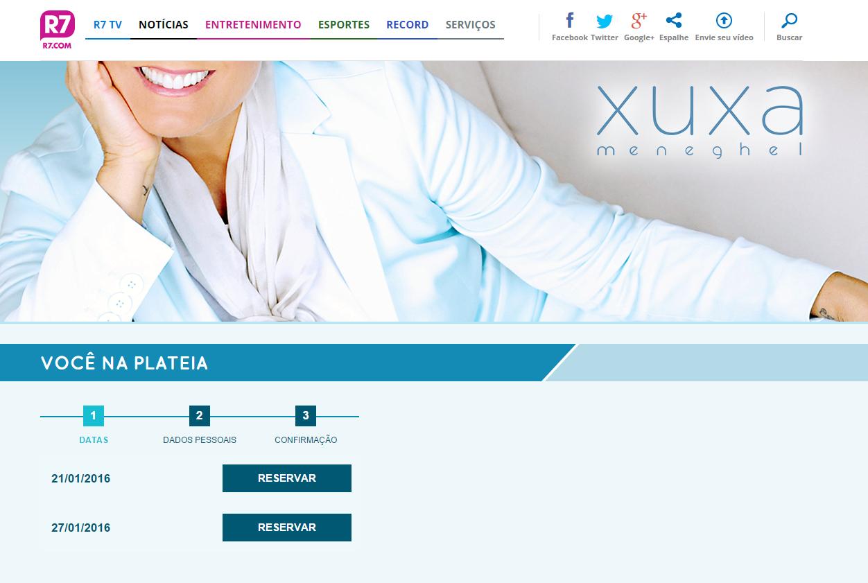 Outra forma de você participar no programa da Xuxa Meneghel é fazendo parte da plateia. Para isso, você deverá se dirigir ao site da R7, procurar pelo programa da Xuxa e clicar em Você na Plateia. Depois aparecerão as datas disponíveis em que você ainda se poderá inscrever, escolha a que você pretende e clique em reservar. Preencha o formulário com o seu e-mail, nome, data de nascimento, telefone residencial e celular, estado e cidade e clique em confirmar. Depois é só aguardar pelo contato da produção para participar na plateia do programa da Xuxa.