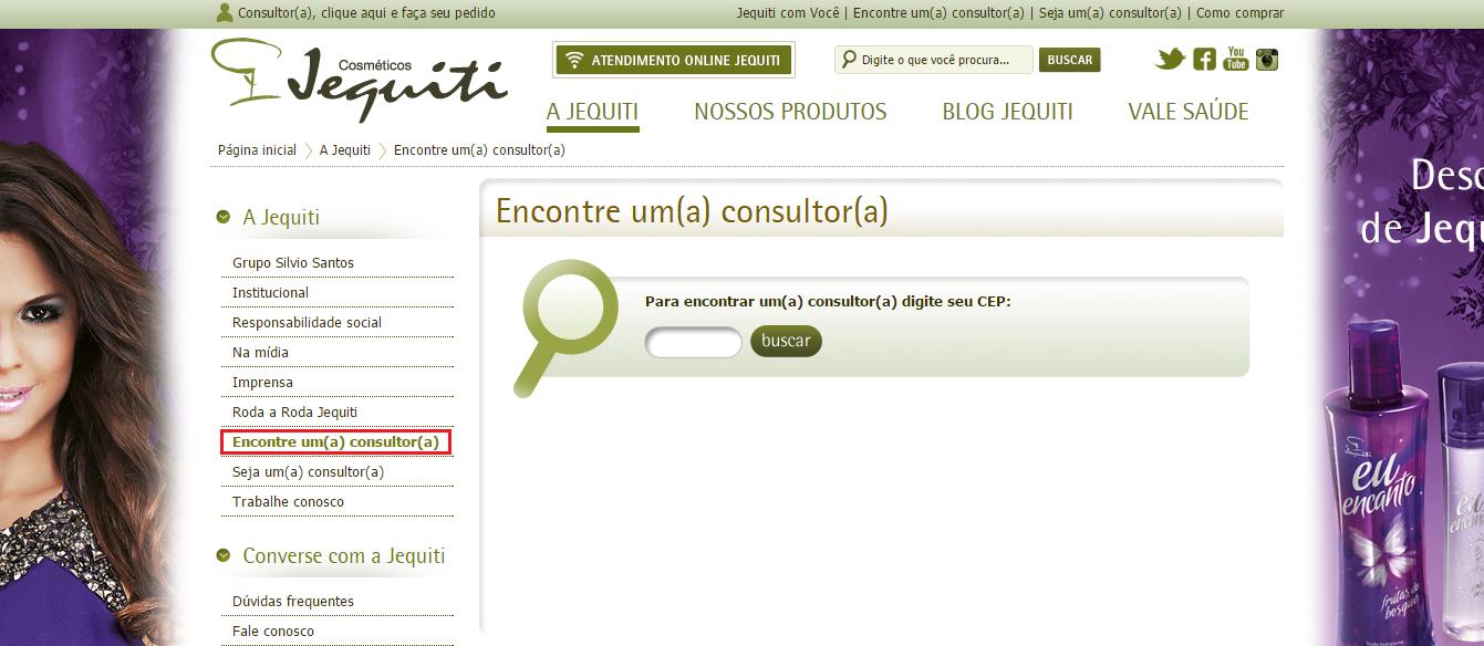 A Jequiti é uma empresa de cosméticos do apresentador Silvio Santos. Essa marca de cosméticos atua no mercado através da venda direta, por isso se você quiser pode se tornar em um consultor Jequiti na sua região. Para isso, basta só entrar no site da Jequiti e se candidatar como consultor. Agora se você não pretende ser consultor, mas deseja comprar produtos Jequiti para conseguir participar no programa Roda a Roda, você pode encontrar no site o consultor mais próximo de você através da ferramenta de busca ou pelo número 0800 776 7575.