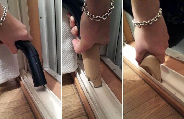 Toda a vez que chega a hora de aspirar o pó da casa o início é bem fácil, áreas grandes, planas onde o bocal do aspirador passa sem problema. E depois começamos a chegar nos locais mais pequenos, onde a sujeira se acumula em monte. Uma ou outra janela deixa de correr e temos de aspirar o local. Problema? O bocal do aspirador é grande demais para encostar. Solução: usar um rolo de papel higiênico, uma das aberturas fica no aspirador de pó e seguramos ela, a outra como é de papel semirrígido conseguimos moldar ele para caber nos caixilhos a fim de limpar.
