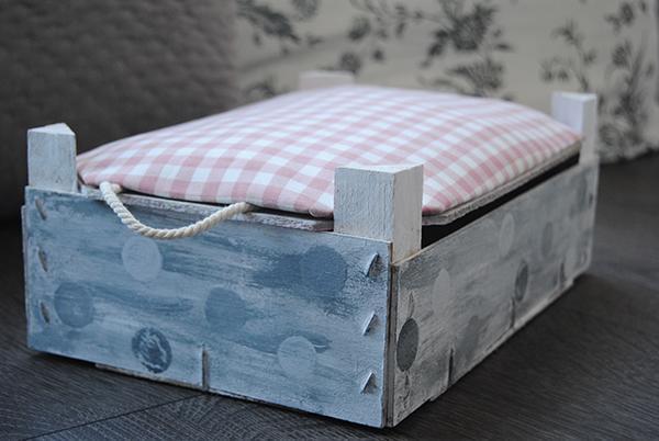 Deste modo, precisará de uma tábua de madeira de um tamanho um pouco menor que a caixa para que encaixe na parte superior, com as pontas cortadas de forma que coincidam com as laterais. Como pode ver na imagem, também podemos adicionar uma cordinha para levantar a tampa e inclusive uma almofada confeccionada com tecido e com enchimento -de algodão ou espuma- para dar um toque mais elegante.